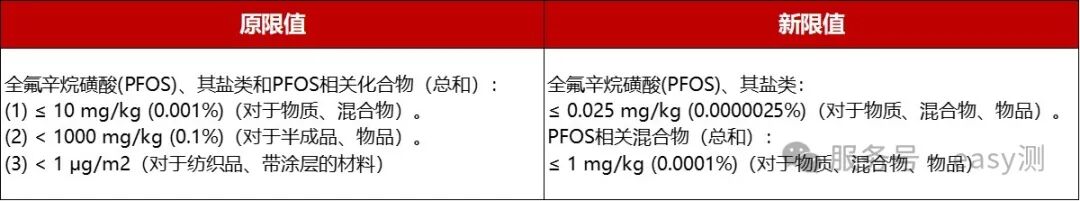 全氟辛基磺酸(PFOS)、其盐类和PFOS相关化合物的含量限值修改如下:
