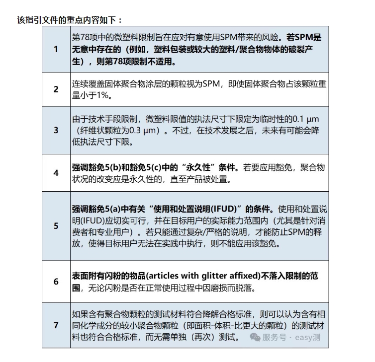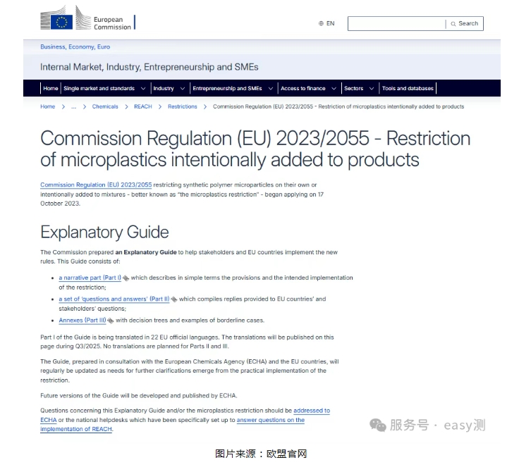 2025年3月31日,欧盟委员会技术服务部发布了一份关于欧盟REACH法规(EC) No 1907/2006附录XVII第78项有关合成聚合物微颗粒(SPM、微塑料)的实施指引文件。该指引文件阐明了监管意图和应用豁免的条件,并为许多常见问题提供了答案。